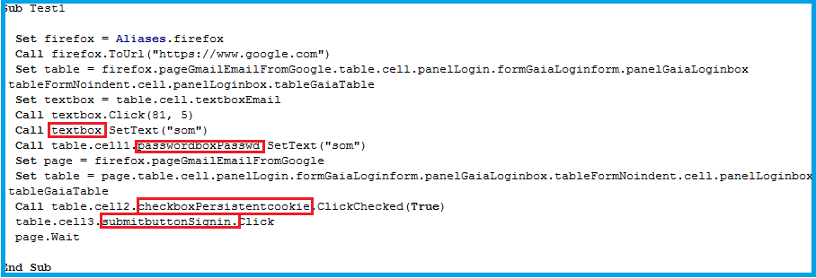 Step2. Call the Page or Website you wish to use for the test. In this instance it is Gmail_Login element. So add – “Aliases.Gmail.”